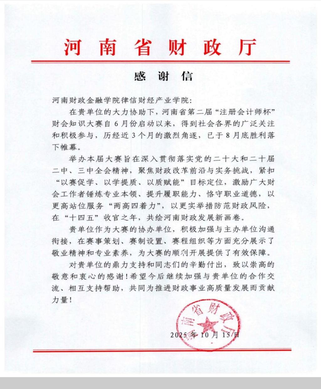 近日,省财政厅向我校律信财经产业学院发来感谢信,对产业学院在河南省第二届“注册会计师杯”财会知识大赛中的辛勤付出和突出贡献给予了高度评价,称赞产业学院以专业素养与协作精神为赛事成功举办提供了有效保障。